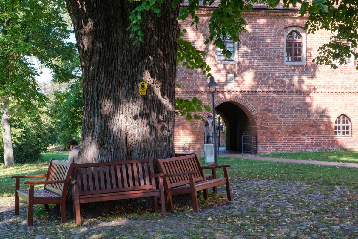 Diese 200 Jahre alte Linde steht in der Klosteranlage Lehnin, an der Rückseite der Klosterkirche St. Marien. Eie rund herun laufende Bank macht sie zu einem schönen Ort für eine Pause.